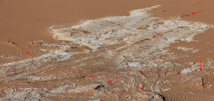 Ägypten, Westliche Wüste, New Valley, Kharga DepressionZahlreiche, liegende Kieselholzstämme und deren Orientierung (Pfeile)